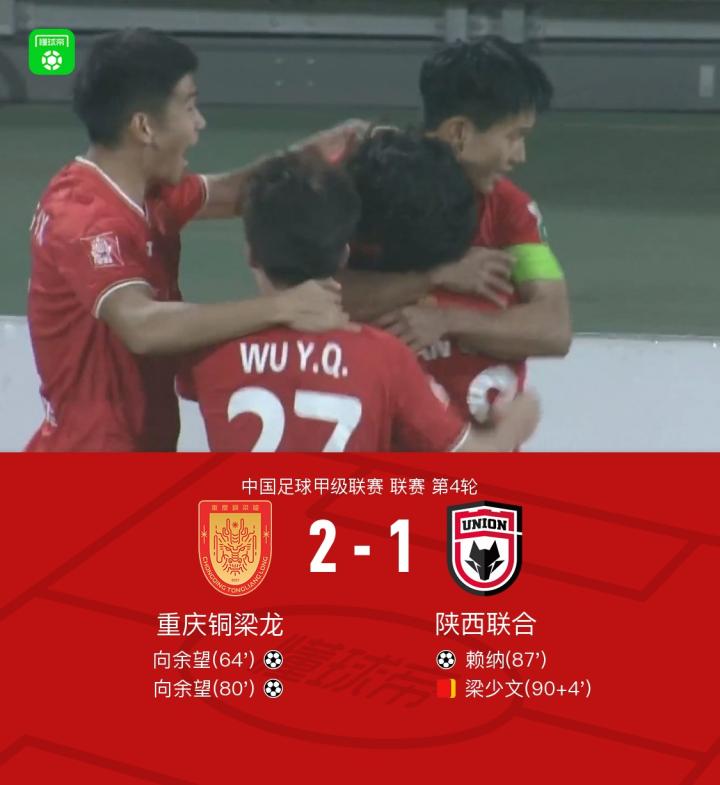 北京时间4月12日,中国足球甲级联赛第4轮,重庆铜梁龙主场迎战陕西联合。比赛中,重庆铜梁龙的向余望表现出色,完成两粒进球,为球队确立领先优势。陕西联合由赖纳打入一球,缩小分差。补时阶段,陕西联合的一名队员因累计两张黄牌被罚出场。全场比赛结束,重庆铜梁龙以2-1战胜陕西联合。
