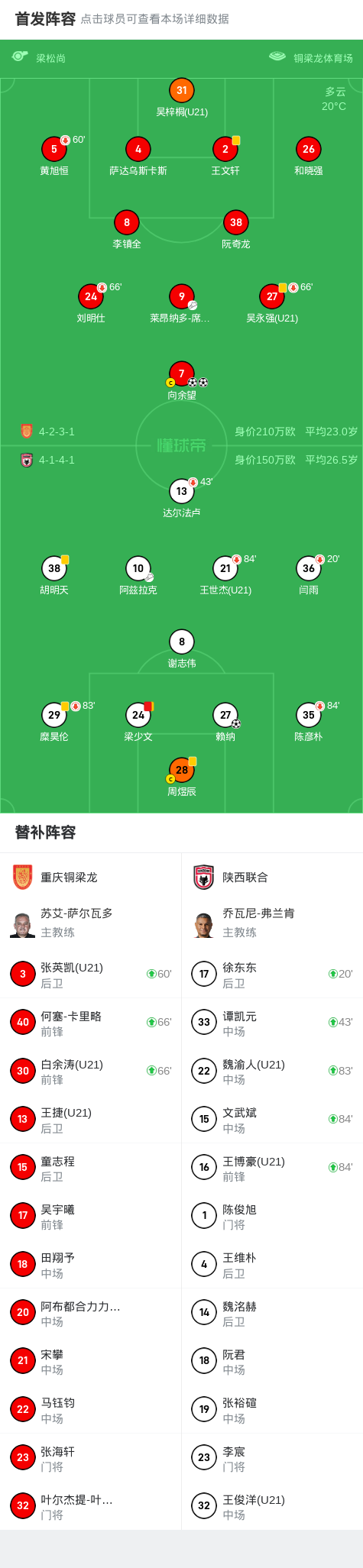 重庆铜梁龙2-1陕西联合,向余望连续4轮比赛建功,赖纳破门