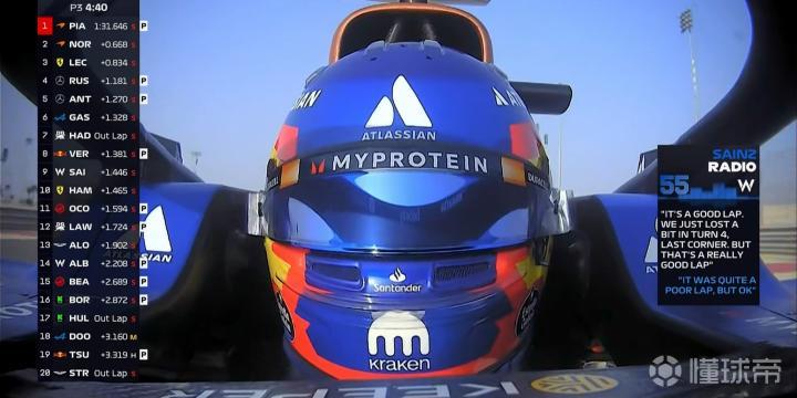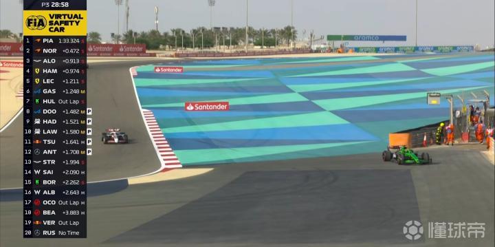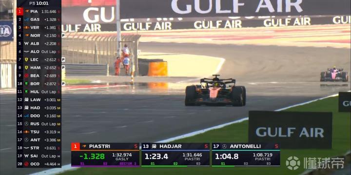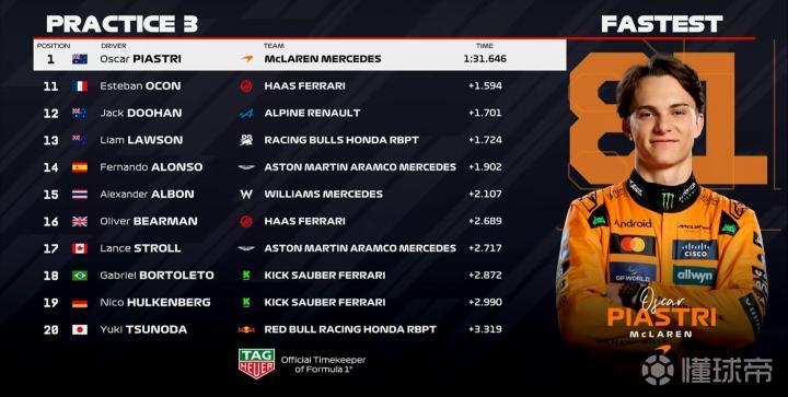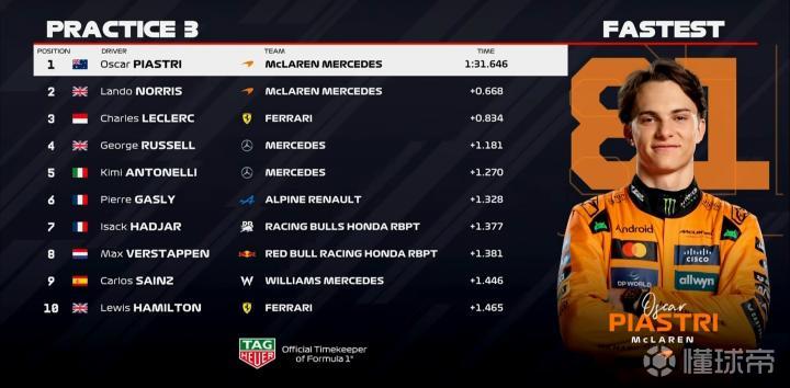 北京时间4月12日,F1巴林大奖赛第三次练习赛结束。皮亚斯特里全场最快,诺里斯、勒克莱尔位居二三。拉塞尔第4,安东内利第5,加斯利第6,哈贾尔第7,维斯塔潘第8,塞恩斯第9,汉密尔顿第10,劳森第13,角田裕毅第20。