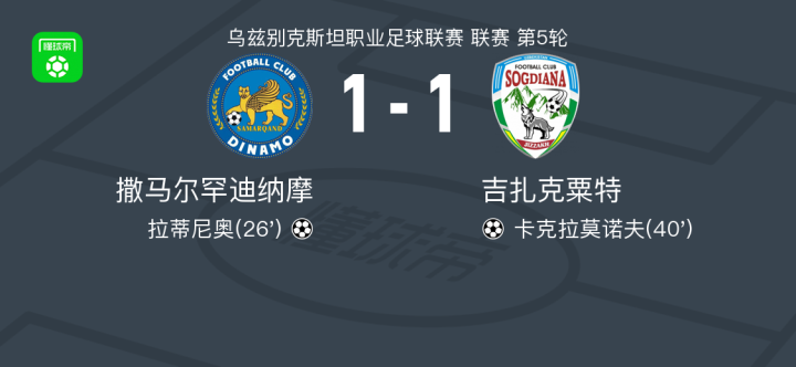 乌兹别克斯坦职业足球联赛第5轮,撒马尔罕迪纳摩主场迎战吉扎克粟特。比赛中,撒马尔罕迪纳摩由拉蒂尼奥完成破门,为主队取得领先。随后,吉扎克粟特凭借卡克拉莫诺夫的进球将比分扳平。最终,双方以1-1的比分结束比赛。