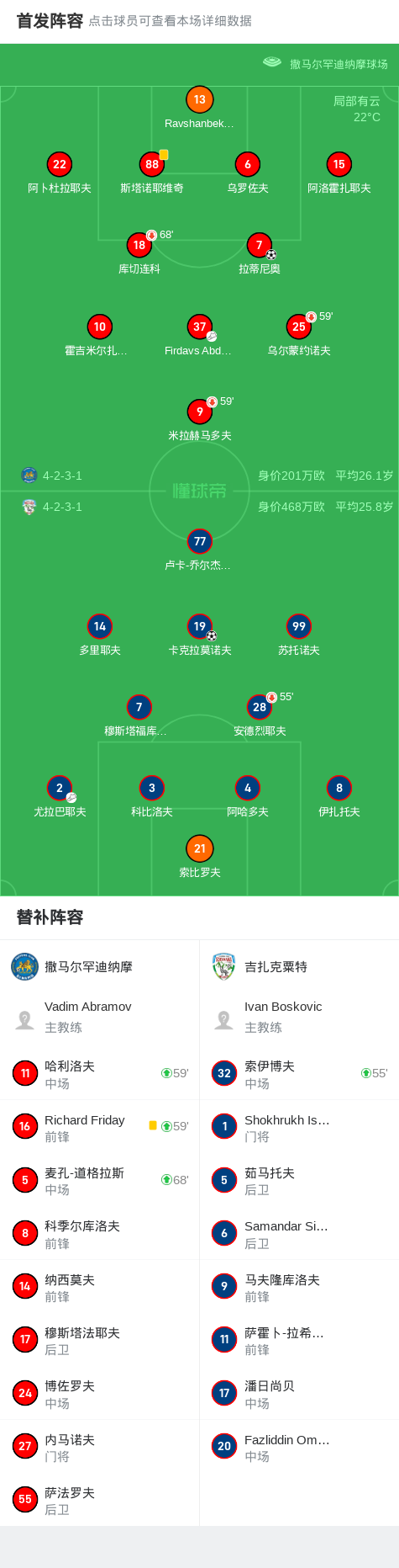 第26分钟,撒马尔罕迪纳摩球员Firdavs Abdurakhmonov助攻拉蒂尼奥打入一球。