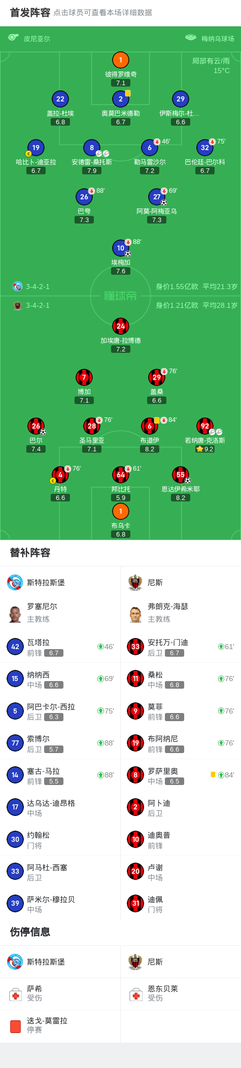 第38分钟,尼斯球员若纳唐-克洛斯助攻巴尔打入一球。