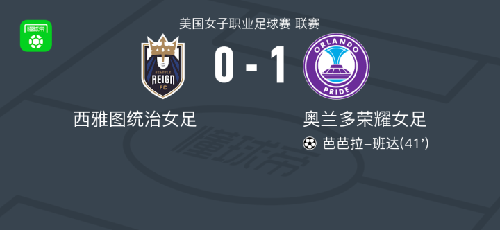 北京时间4月13日美国女子职业足球赛 联赛,西雅图统治女足主场对阵奥兰多荣耀女足。奥兰多荣耀女足芭芭拉-班达破门。最终比分西雅图统治女足 0-1 奥兰多荣耀女足。