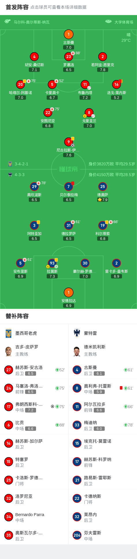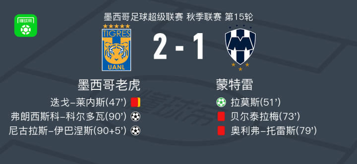 北京时间4月13日墨西哥足球超级联赛 秋季联赛 第15轮,墨西哥老虎主场对阵蒙特雷。墨西哥老虎弗朗西斯科-科尔多瓦破门,尼古拉斯-伊巴涅斯破门。蒙特雷拉莫斯破门。最终比分墨西哥老虎 2-1 蒙特雷。