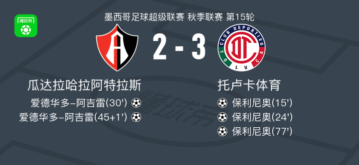 墨西哥足球超级联赛秋季联赛第15轮,瓜达拉哈拉阿特拉斯主场迎战托卢卡体育。比赛中,托卢卡体育的保利尼奥表现出色,完成帽子戏法,分别为球队取得领先。瓜达拉哈拉阿特拉斯方面,爱德华多-阿吉雷同样有出色发挥,梅开二度帮助球队紧咬比分。最终,托卢卡体育以3-2战胜瓜达拉哈拉阿特拉斯,带走宝贵三分。