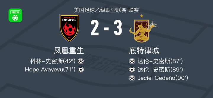 底特律城3-2逆转凤凰重生,达伦-史密斯两球,Jeciel Cedeño破门