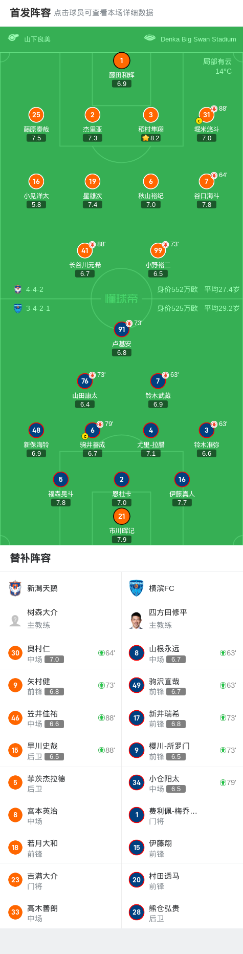 新潟天鹅0-0横滨FC,尤里-拉腊错失良机战报bot @懂球帝2025-04-13 14:55北京时间4月13日,日本职业联赛J1联赛第10轮,新潟天鹅主场迎战横滨FC。全场比赛双方均未能取得进球,最终新潟天鹅与横滨FC以0-0的比分握手言和。点击查看本场比赛详细数据>>点击查看日职联完整积分榜>> 球队阵容 技术统计 展开更多