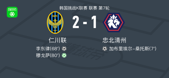 北京时间4月13日,韩国挑战K联赛联赛第7轮,仁川联主场迎战忠北清州。比赛中,忠北清州由加布里埃尔-桑托斯率先取得进球,为客队建立领先优势。随后,仁川联展开反击,李东律成功打入一球扳平比分。紧接着,穆戈萨通过点球机会帮助球队反超比分。最终,仁川联以2-1战胜忠北清州。