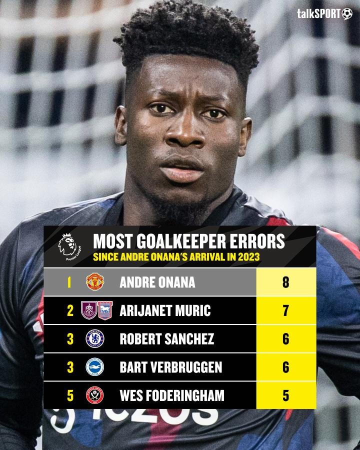 据talkSPORT统计,奥纳纳加盟曼联以来近两个赛季,他是英超失误导致丢球次数最多的门将,达到8次。