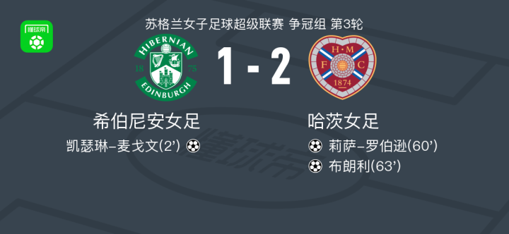 北京时间4月13日,苏格兰女子足球超级联赛争冠组第3轮,希伯尼安女足主场迎战哈茨女足。比赛中,希伯尼安女足由凯瑟琳-麦戈文率先取得进球。哈茨女足随后展开反击,莉萨-罗伯逊和布朗利接连破门完成反超。最终,希伯尼安女足1-2不敌哈茨女足。