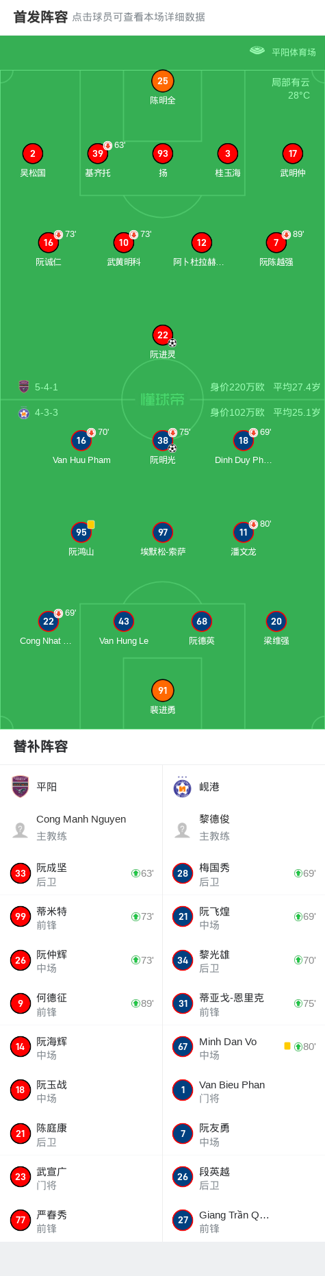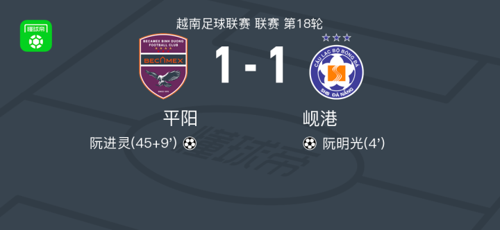 越南足球联赛第18轮,平阳主场迎战岘港。比赛中,岘港由阮明光率先取得进球,为球队取得领先。随后,平阳凭借阮进灵的进球将比分扳平。最终,双方以1-1的比分结束比赛。