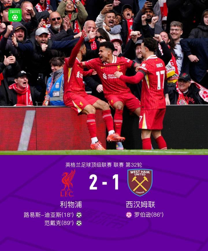 北京时间4月13日,英格兰足球顶级联赛第32轮,利物浦主场迎战西汉姆联。比赛中,路易斯-迪亚斯接队友助攻打入一球为利物浦取得领先。随后,罗伯逊不慎将球送入自家球门,西汉姆联扳平比分。关键时刻,范戴克接到麦卡利斯特的助攻完成破门,帮助利物浦再次超出比分。最终,利物浦以2-1战胜西汉姆联。
