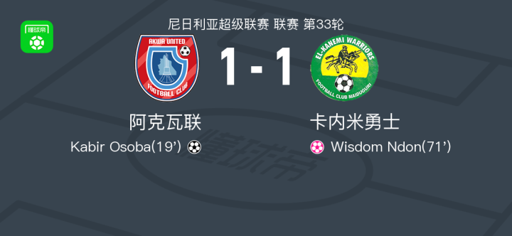 北京时间4月13日,尼日利亚超级联赛第33轮,阿克瓦联主场迎战卡内米勇士。比赛中,阿克瓦联由Kabir Osoba攻入一球取得领先,但随后Wisdom Ndon不慎自摆乌龙,使得对手扳平比分。最终,阿克瓦联与卡内米勇士以1-1的比分握手言和。
