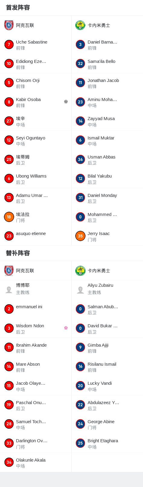 第19分钟,阿克瓦联球员Kabir Osoba打入一球。