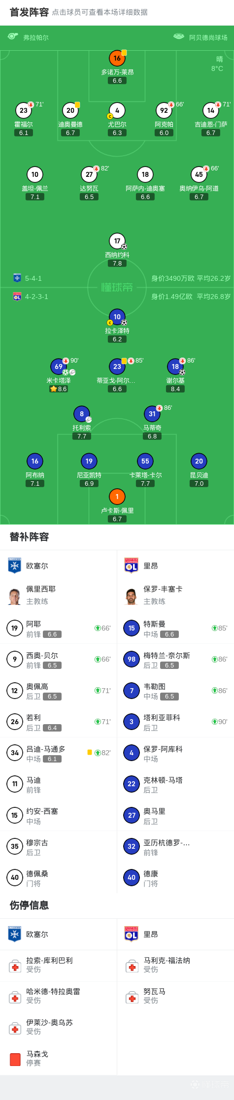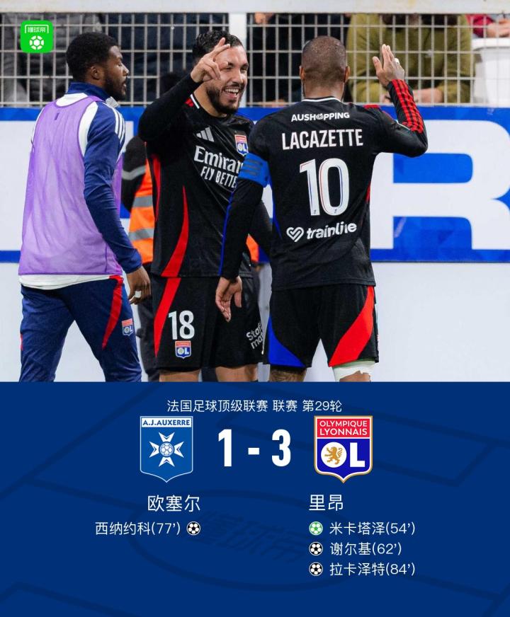 法国足球顶级联赛第29轮,欧塞尔主场迎战里昂。比赛中,里昂凭借米卡塔泽的点球率先取得领先,随后谢尔基接托利索助攻扩大比分。欧塞尔由西纳约科扳回一城,但拉卡泽特在米卡塔泽的助攻下完成破门锁定胜局。最终,欧塞尔1-3不敌里昂。