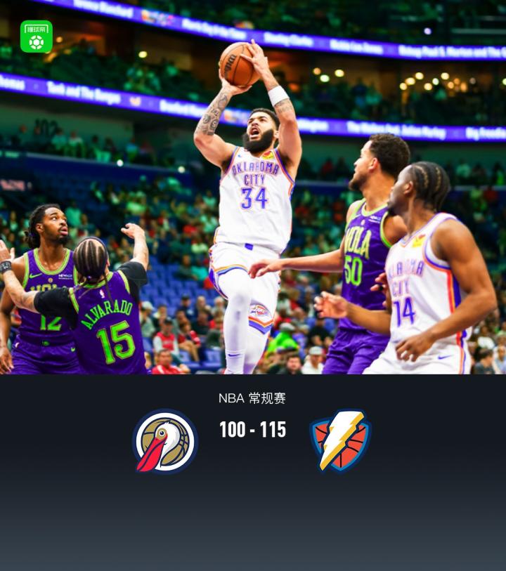 第四节鹈鹕奎诺内斯拿下10分,雷霆以赛亚-乔拿下10分,最终鹈鹕100-115不敌雷霆