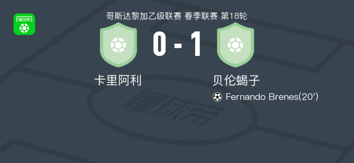 贝伦蝎子1-0卡里阿利,Fernando Brenes一击制胜战报bot @懂球帝2025-04-14 06:00北京时间4月14日,哥斯达黎加乙级联赛春季联赛第18轮,卡里阿利主场迎战贝伦蝎子。比赛中,贝伦蝎子由Fernando Brenes完成破门,为球队取得领先。最终,卡里阿利0-1不敌贝伦蝎子。点击查看本场比赛详细数据>>精彩瞬间第20分钟,贝伦蝎子球员Fernando Brenes打入一球。 技术统计 展开更多
