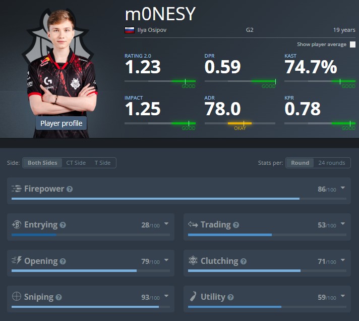 m0NESY自2022年1月起正式离开NAVI青训,加盟G2并效力至今,出战519张地图、12529个回合,收获9732个击杀,平均Rating高达1.23,帮助队伍拿下6座S级赛事冠军(2022年BLAST世决、2023年IEM卡托、2023年IEM科隆、2024年IEM达拉斯、2024年BLAST秋决、2024年BLAST世决),并斩获4个HLTV-MVP奖牌,被评为2022年TOP7、2023年TOP4、2024年TOP2,是当今CS世界最炙手火热的狙击手之一。