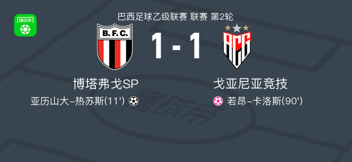 北京时间4月14日,巴西足球乙级联赛第2轮,博塔弗戈SP主场迎战戈亚尼亚竞技。比赛中,博塔弗戈SP由亚历山大-热苏斯取得进球,但若昂-卡洛斯不慎将球送入自家球门,最终双方以1-1的比分握手言和。