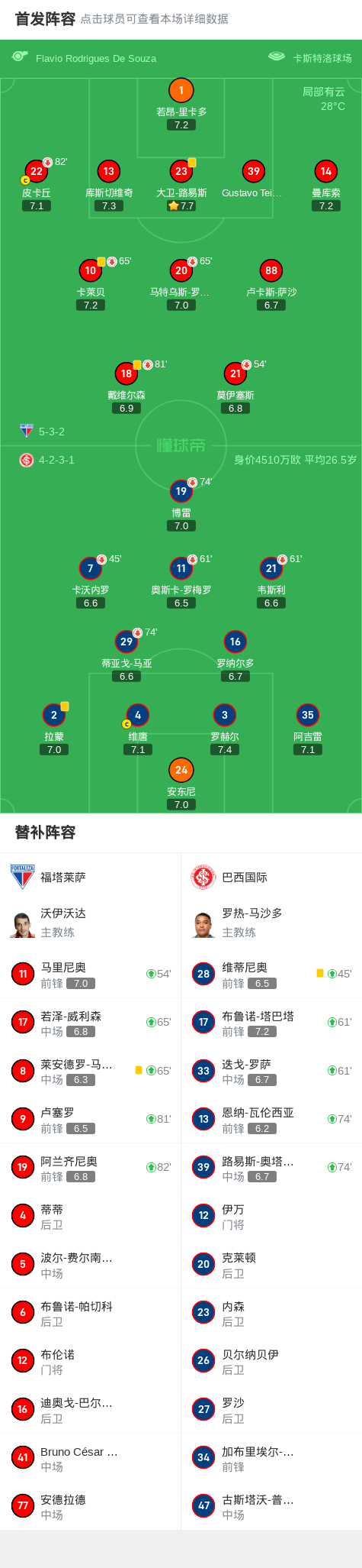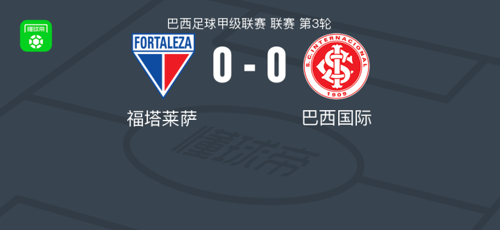 福塔莱萨0-0巴西国际,场面火爆,两队6人染黄战报bot @懂球帝2025-04-14 08:57北京时间4月14日,巴西足球甲级联赛第3轮,福塔莱萨主场迎战巴西国际。全场比赛双方均未能取得进球,最终福塔莱萨与巴西国际互交白卷,以0-0的比分握手言和。点击查看本场比赛详细数据>>点击查看巴甲完整积分榜>> 球队阵容 技术统计 展开更多