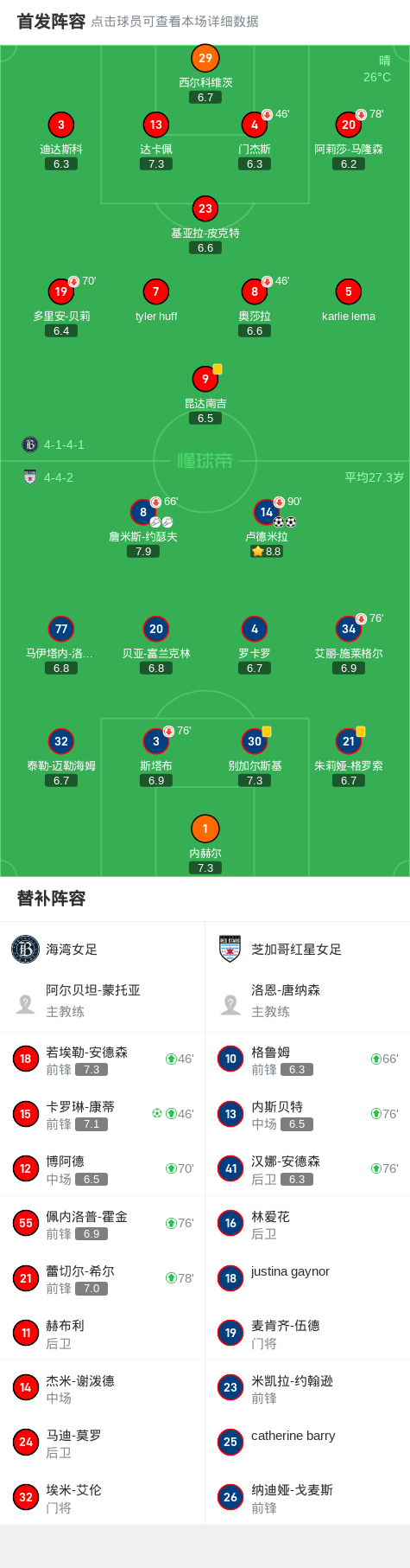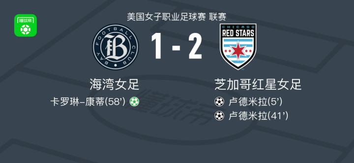 北京时间4月14日美国女子职业足球赛 联赛,海湾女足主场对阵芝加哥红星女足。海湾女足卡罗琳-康蒂破门。芝加哥红星女足卢德米拉梅开二度。最终比分海湾女足 1-2 芝加哥红星。