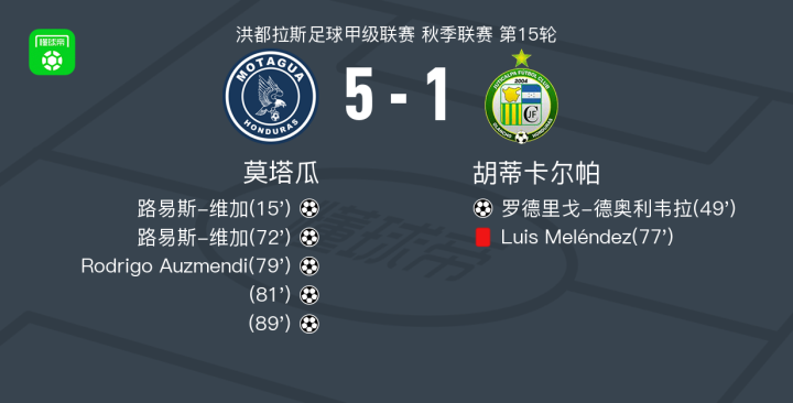 北京时间4月14日洪都拉斯足球甲级联赛 秋季联赛 第15轮,莫塔瓜主场对阵胡蒂卡尔帕。莫塔瓜路易斯-维加梅开二度,Rodrigo Auzmendi破门。胡蒂卡尔帕罗德里戈-德奥利韦拉破门。最终比分莫塔瓜 5-1 胡蒂卡尔帕。