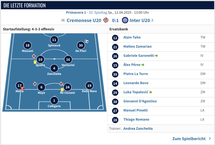 首发:卡利加里斯/德拉·莫拉 雷·切科尼 梅耶 莫塔/文图里尼 赞凯塔 奎耶托/德·皮耶里 斯皮纳切 莫斯科尼。