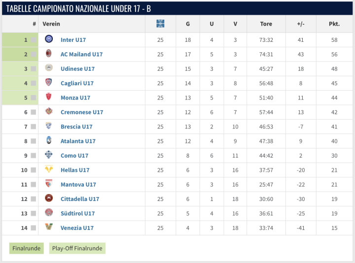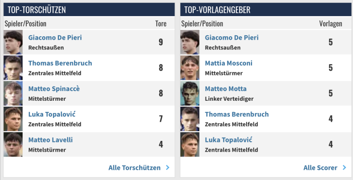 国际米兰这边达戈斯蒂诺梅开二度,他是08年的中场球员,本赛季已经多次上调u18,此外昨天提到的维尔图阿尼本赛季大部分时间也是在u17,偶尔上调到u18。u17的最佳射手是打入12球的卡拉拉,不过很多人认为他潜力不高。助攻最多的是莫雷萨,他本赛季为u17打入7球。值得注意的是他为u18打入了4球助攻1球。被称为小恰20的,拉托雷打入11球,他场上司职的位置和恰20一样是单后腰。