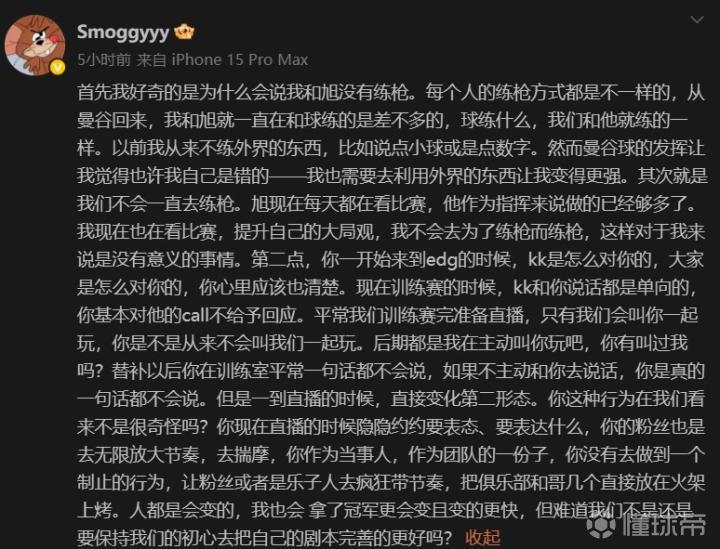 Smoggy在回应练枪问题后,也指出S1Mon在训练沟通中存在大问题,在面对队伍其他人的沟通时经常不做出回应,在直播时也放任粉丝带节奏,不管俱乐部的安危。