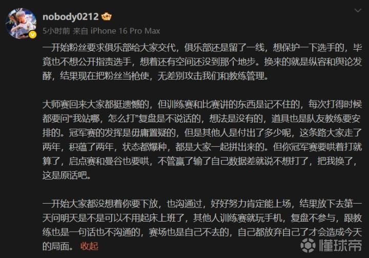 作为队伍指挥,nobody表示俱乐部本想第一时间保护选手,却没想到S1Mon把粉丝当枪使,王哥直接指出S1Mon曾表示自己不想打了,甚至不与教练沟通,不前往赛场。