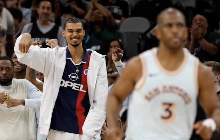 死忠球迷,文班亚马穿2001-2002赛季的巴黎球衣观看马刺比赛