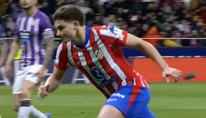 此役主场对阵巴拉多利德,阿尔瓦雷斯在上半场第25分钟主罚点球破门,帮助马德里竞技将比分扳为1-1。