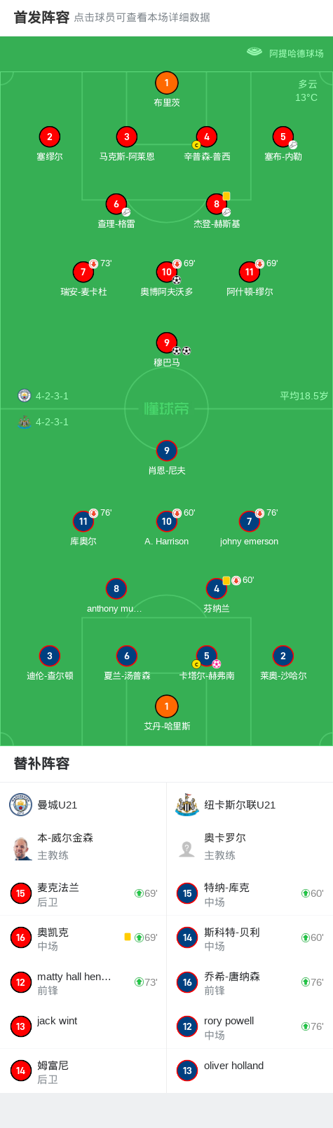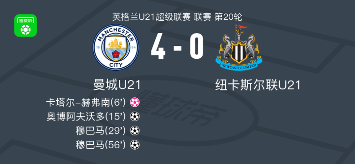 北京时间4月15日英格兰U21超级联赛 联赛 第20轮,曼城U21主场对阵纽卡斯尔联U21。曼城U21奥博阿夫沃多破门,穆巴马梅开二度。纽卡斯尔联U21卡塔尔-赫弗南自摆乌龙。最终比分曼城U21 4-0 纽卡斯尔联U21。