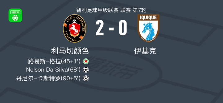 北京时间4月15日智利足球甲级联赛 联赛 第7轮,利马切颜色主场对阵伊基克。利马切颜色Nelson Da Silva破门,丹尼尔-卡斯特罗破门。最终比分利马切颜色 2-0 伊基克。