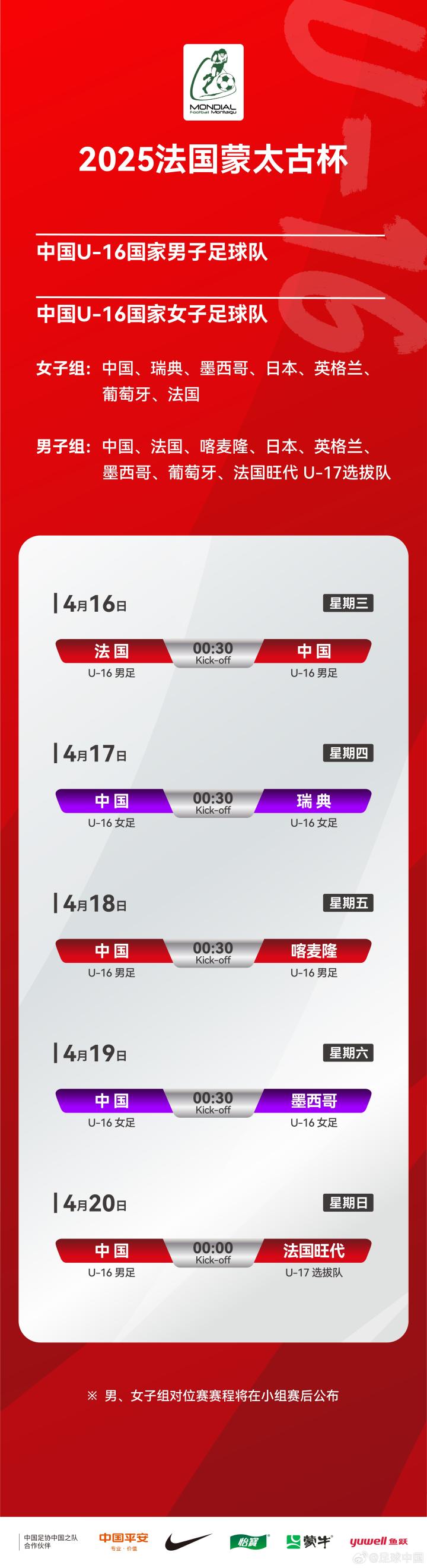 中国U-16男足和中国U-16女足应邀出战在法国蒙太古举行的第52届蒙太古杯,这是中国队历史上第10次参加该项赛事。本届蒙太古杯分为三个组别,分别是男子国家队组、女子国家队组和俱乐部队组,参赛球员均为U-16年龄段球员。中国U-16女足首轮轮空,剩余两个对手为瑞典和墨西哥。中国U-16男足将代表中国率先出场。