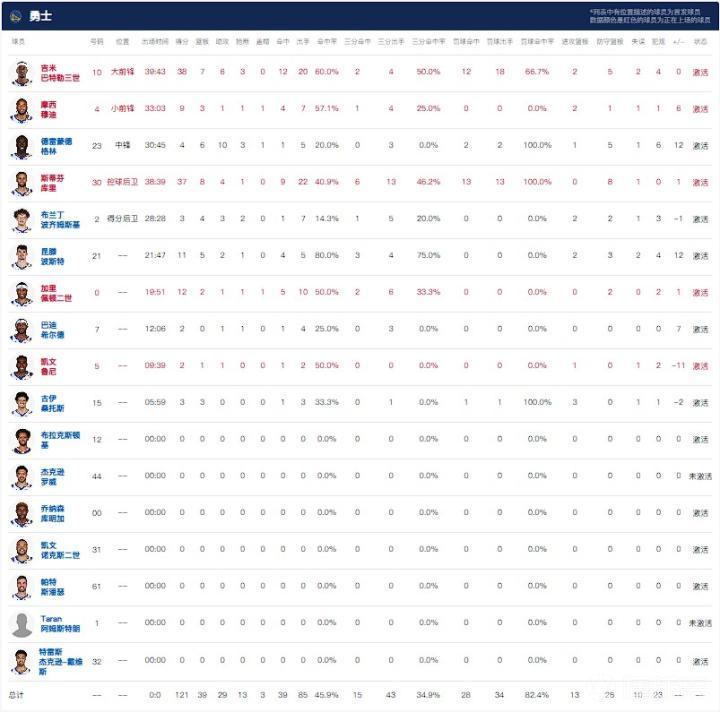 金州勇士吉米-巴特勒38分7板6助3断,斯蒂芬-库里37分8板4助1断,小佩顿12分2板1助1断1帽;