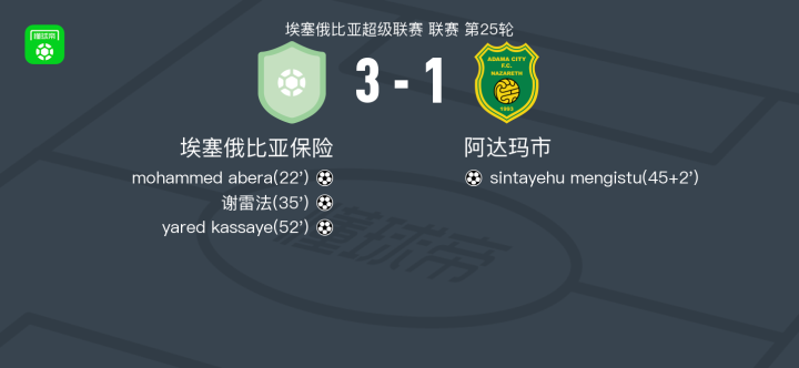 北京时间4月16日,埃塞俄比亚超级联赛第25轮,埃塞俄比亚保险主场迎战阿达玛市。比赛中,埃塞俄比亚保险由mohammed abera率先建功,随后谢雷法扩大比分。阿达玛市则由sintayehu mengistu追回一球。比赛后程,yared kassaye为埃塞俄比亚保险再入一球锁定胜局。最终,埃塞俄比亚保险以3-1战胜阿达玛市。