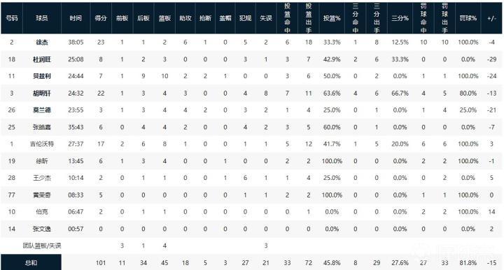 广东东阳光徐杰22分2板6助1断,胡明轩22分4板3助,吉伦沃特17分8板1助。