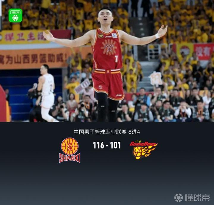 第四节,广东徐杰连攻带传策动进攻与山西拉锯,分差维持10分上下,节中段山西迪亚洛与广东杜润旺爆发肢体冲突,胡明轩再领一次技犯累积之前违体直接驱逐出场,山西借势迪亚洛连续冲框得分,随着原帅三分连中三分再度拉大至18分,广东徐杰站出来连续得分反扑无果,最终山西116-101战胜广东。