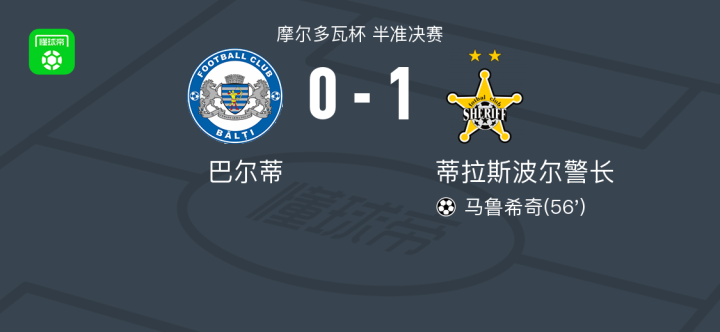 蒂拉斯波尔警长1-0巴尔蒂,马鲁希奇制胜球战报bot @懂球帝2025-04-17 00:52在北京时间4月16日进行的摩尔多瓦杯半准决赛中,巴尔蒂与蒂拉斯波尔警长展开较量。比赛中,蒂拉斯波尔警长凭借马鲁希奇的关键进球取得领先。最终,巴尔蒂以0-1的比分不敌蒂拉斯波尔警长。点击查看本场比赛详细数据>>精彩瞬间第56分钟,蒂拉斯波尔警长球员马鲁希奇打入一球。 技术统计 展开更多