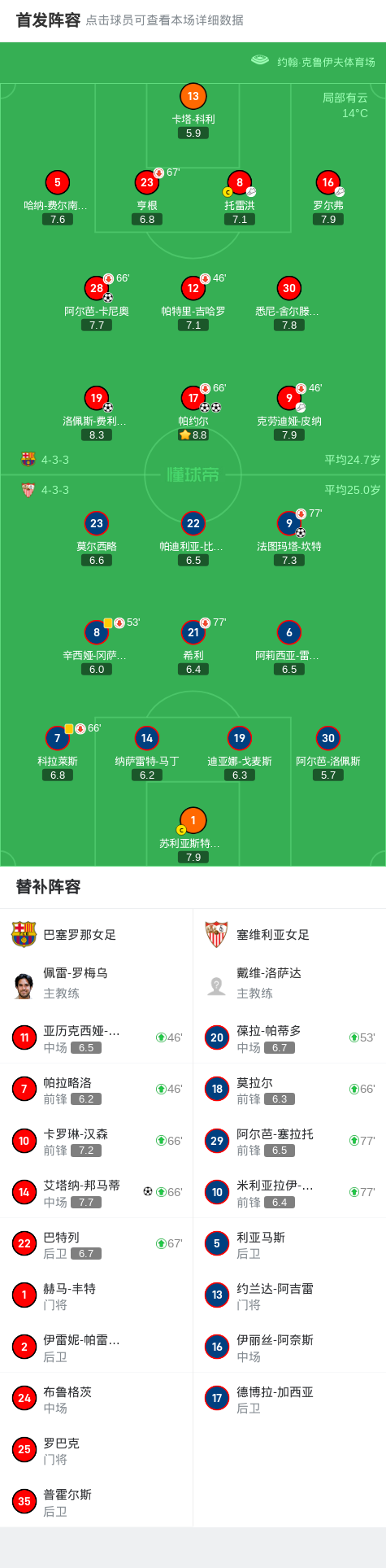 巴塞罗那女足5-1大胜塞维利亚女足,帕约尔梅开二度,艾塔纳-邦马蒂建功