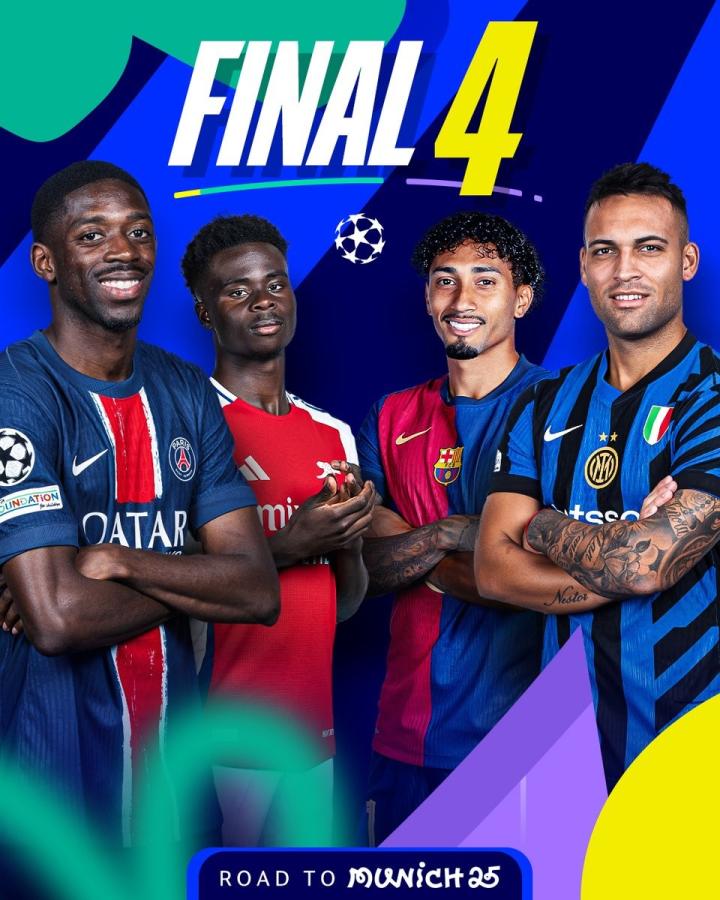 欧冠四强分别是来自法国的巴黎圣日耳曼、英格兰的阿森纳、西班牙的巴塞罗那和意大利的国际米兰。