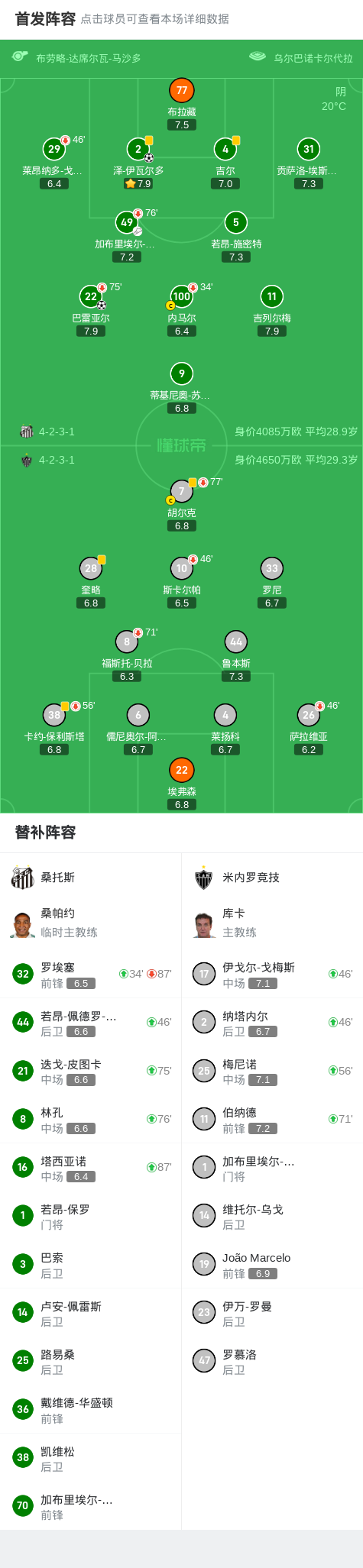 桑托斯2-0米内罗竞技,内马尔伤退,巴雷亚尔、泽-伊瓦尔多破门