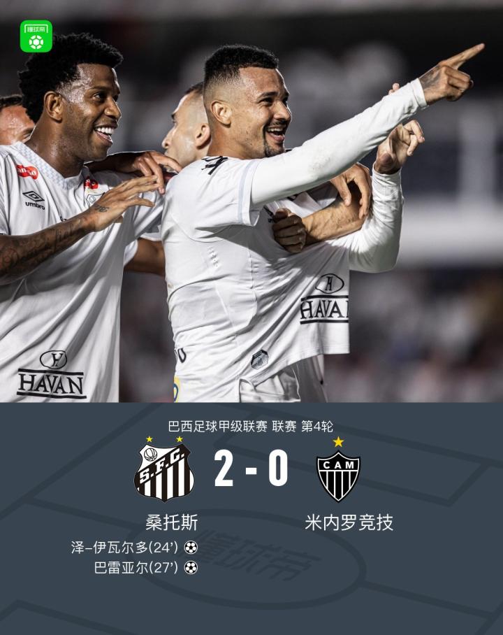 北京时间4月17日,巴西足球甲级联赛第4轮,桑托斯主场迎战米内罗竞技。比赛中,桑托斯展现出强大攻击力,泽-伊瓦尔多成功取得进球为球队首开纪录,随后巴雷亚尔在队友加布里埃尔-邦滕波的助攻下再下一城。最终,桑托斯以2-0战胜米内罗竞技。