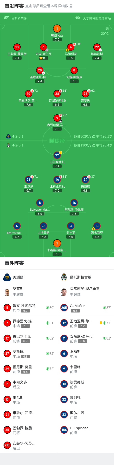 北京时间4月17日墨西哥足球超级联赛 秋季联赛 第16轮,美洲狮主场对阵桑托斯拉古纳。美洲狮吉列尔莫-马丁内斯破门,内森-席尔瓦破门。最终比分美洲狮 2-0 桑托斯拉古纳。