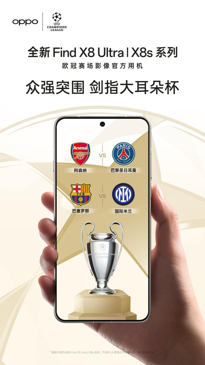 众强突围,剑指大耳朵杯! 本赛季的欧冠四强已全部出炉!半决赛即将上演的对决也已尘埃落定:阿森纳vs巴黎圣日耳曼、巴塞罗那vs国际米兰。 四支豪强逐鹿欧洲之巅,最终会是哪两支球队会师决赛战场呢?快来评论区写下你的预测,小欧将抽取预测正确的一名幸运粉丝送出OPPO × 欧冠联名礼品一份! 全新 OPPO Find X8 Ultra|X8s 系列,欧冠赛场影像官方用机,持续记录赛场上的精彩时刻,只管去踢趁现在!
