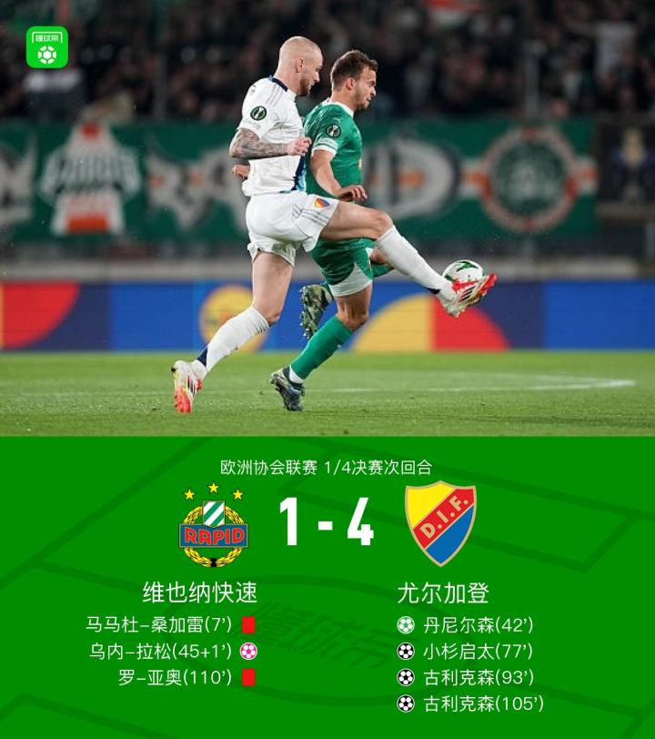 北京时间4月18日欧洲协会联赛 1/4决赛次回合,维也纳快速对阵尤尔加登。尤尔加登丹尼尔森破门,小杉启太破门,古利克森梅开二度,乌内-拉松自摆乌龙。最终比分维也纳快速 1-4 尤尔加登。两回合总比分维也纳快速2-4尤尔加登。