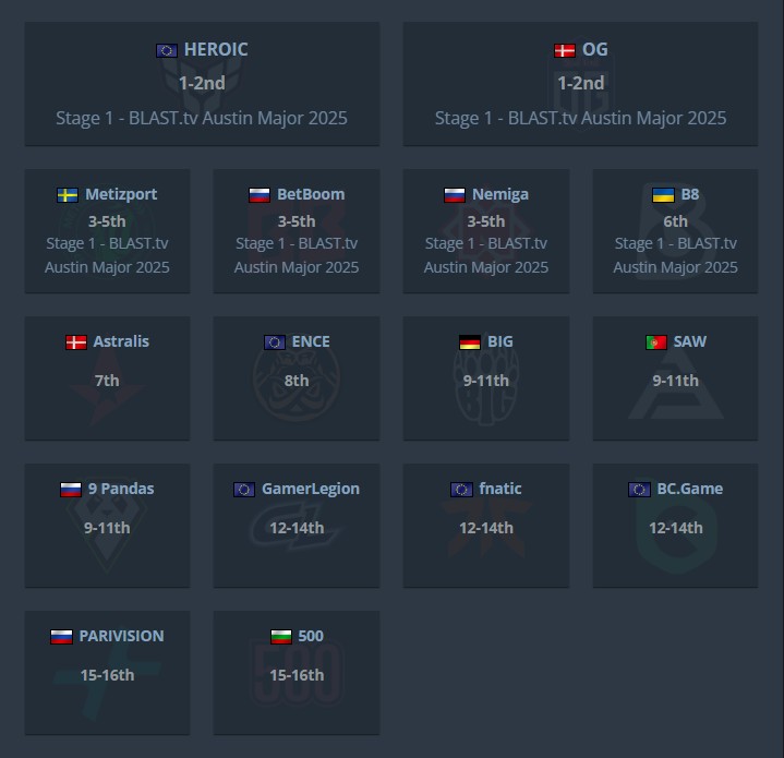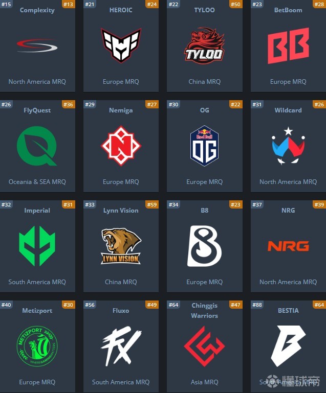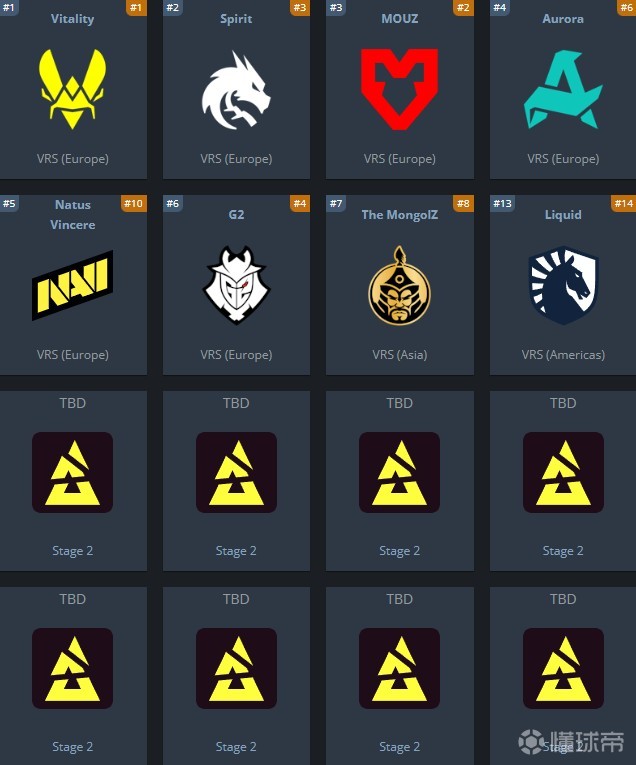 此次赛事共16支队伍依靠地区VRS积分直通Major,另外16支队伍则通过地区预选赛获取名额,以下是各地区预选赛名次。