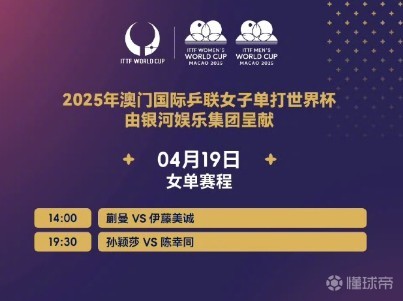 乒乓球世界杯19日赛程:14:45王楚钦vs雨果,19:30孙颖莎vs陈幸同南京伦敦体育场小杨 @懂球帝2025-04-18 22:37北京时间4月18日,2025澳门乒乓球世界杯男/女单四强全部产生,且4月19日(明日)赛程出炉。具体赛程如下:14:00 女子场地 蒯曼🇨🇳vs伊藤美诚🇯🇵14:45 男子场地 王楚钦🇨🇳vs雨果-卡尔德拉诺🇧🇷19:30 女子场地 孙颖莎🇨🇳vs陈幸同🇨🇳20:15 男子场地 林诗栋🇨🇳vs梁靖崑🇨🇳 展开更多