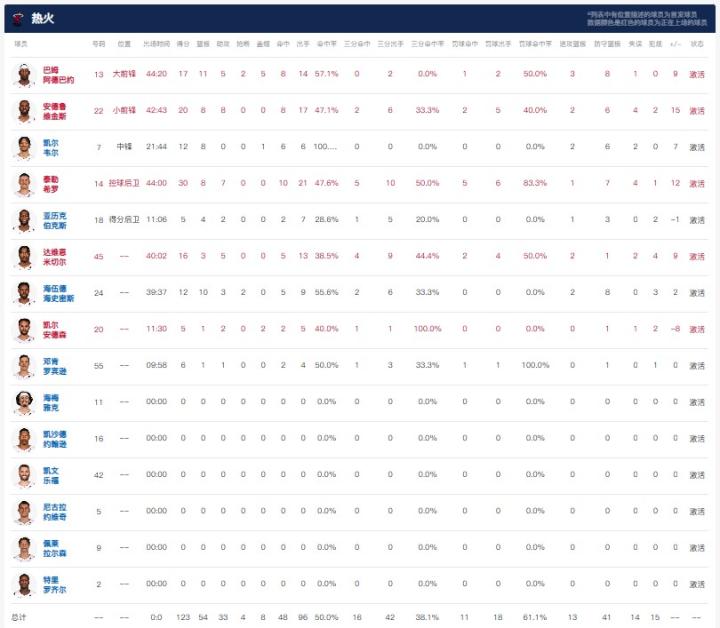 迈阿密热火希罗30分8板7助,维金斯20分8板8助,阿德巴约17分11板5助5帽。
